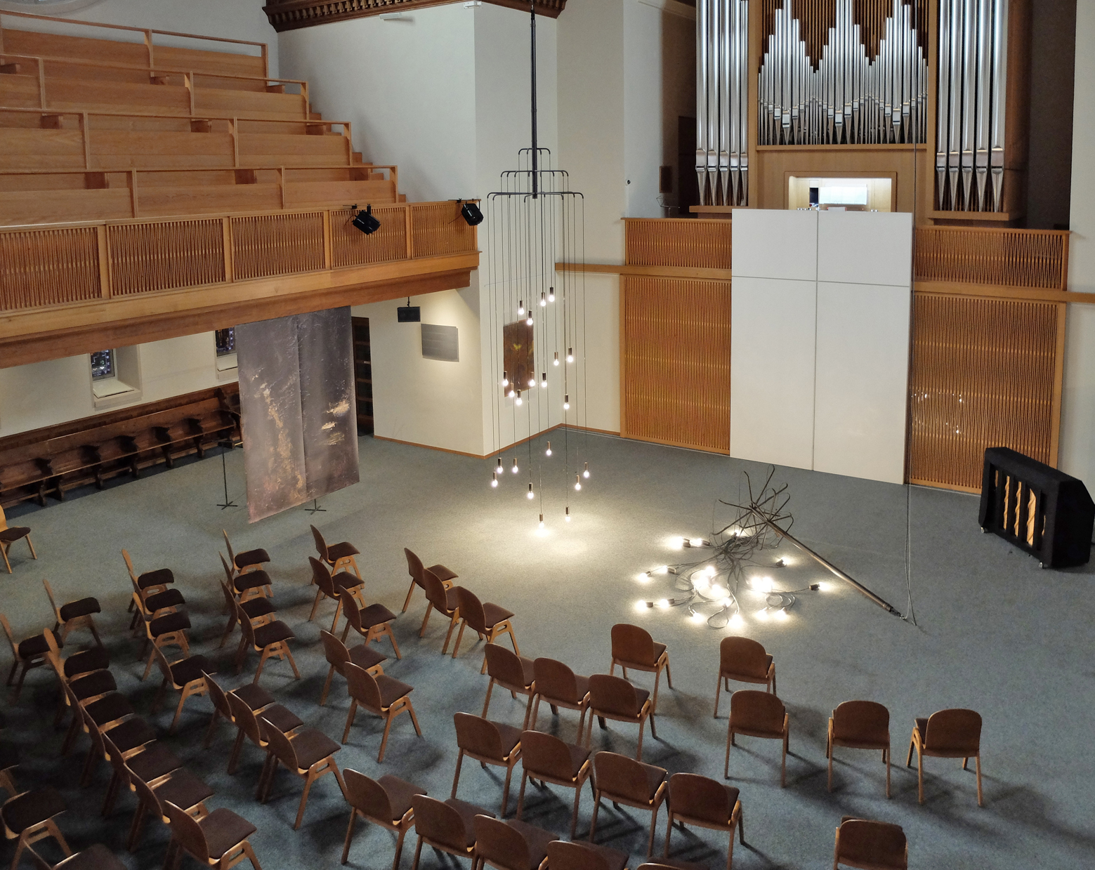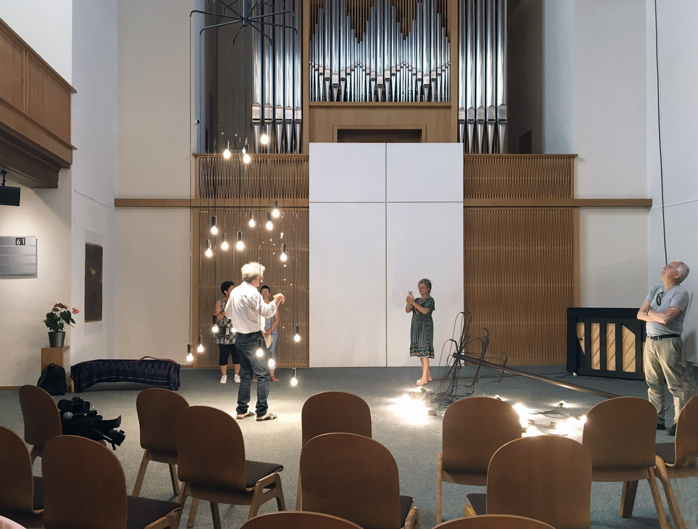 „chantier en lumière“ Röumliche Interventionen: Licht-Installation (mit bestehenden Leuchtern), Stuhllager im Eingangsbereich.
